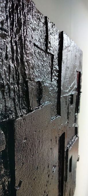 Abstrakcyjny relief wykonany ze szkÅ‚a, w którym Å›wiatÅ‚o i cieÅ„ tworzÄ… wÅ‚asny jÄ™zyk przestrzeni. Ciemna, niemal monolityczna powierzchnia kryje subtelne niuanse faktur i wyrazisty ryt geometrycznych podziaÅ‚ów. Praca balansuje pomiÄ™dzy materialnoÅ›ciÄ… szkÅ‚a, a jego zdolnoÅ›ciÄ… do ukrywania i odsÅ‚aniania.